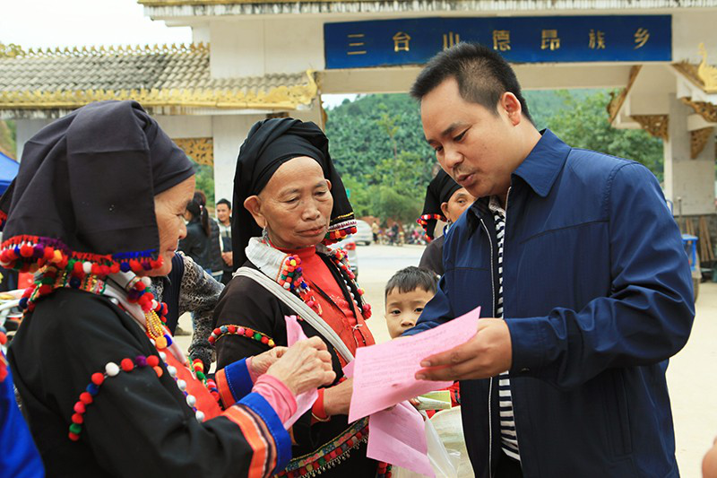 三臺(tái)山徳昂族鄉(xiāng)鄉(xiāng)長(zhǎng)楊愛明和德昂族群眾參加農(nóng)業(yè)科技推廣活動(dòng)