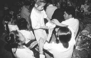 凌晨5點,我同玉波一起被她的家人叫醒,這是我一再叮囑的,要參加賧的全過程。而玉波卻揉著睡眼惺忪的眼睛哭了起來,嘴里叫著“嗨暖、嗨暖”(想睡覺、想睡覺),顯然是為打擾了她的好覺而不高興。但她今天不能不去,今天她家是專為她賧“薩拉帥”,她是主角。母親玉金不管她哭不哭,拉著她的手就走。