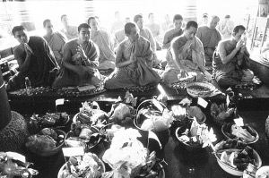 早晨8點多鐘,隨著緬寺大佛爺都比罕念誦起那古老的滴水詞經(jīng),賧奉儀式開始了。我隨玉波一家坐在從家里帶來的涼席上。緬寺里已擺放不下人們送來賧奉的物品,只好放在緬寺的周圍。人們用一根白線拴系著物品連著緬寺,以示并沒有遠(yuǎn)離緬寺和佛祖。