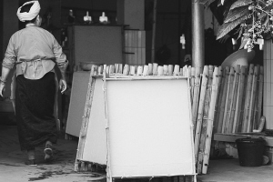 澆紙是在紙槽中進(jìn)行的,不但需要強(qiáng)勁的臂力,還需要相當(dāng)?shù)募?xì)心。在紙槽中舀水的時(shí)候,雙臂承受的重量不下10公斤,紙要澆得恰到好處,澆輕了紙就太薄,澆重了紙又太厚。太薄出不了好品相,太厚會增加成本。這是整個(gè)構(gòu)紙成品的關(guān)鍵,經(jīng)驗(yàn)老到的傣族老人,都不會在這道工序上馬虎。一雙手游走在澆紙槽,或輕輕拍打,或慢慢游弋,絮狀的纖維時(shí)而附著在手上,時(shí)而又歡呼雀躍地散開,頑皮得有點(diǎn)像芒團(tuán)村水塘邊遇上的那些孩子。憑感覺均勻了,老人這才輕輕將澆紙盤脫離水面,一眨眼功夫,一張構(gòu)紙便在盤上現(xiàn)出端倪。接下來的事就交給陽光了,如果雨季來臨,構(gòu)紙就停止生產(chǎn)。所以說,芒團(tuán)構(gòu)紙常常浸漬著一種陽光的味道。