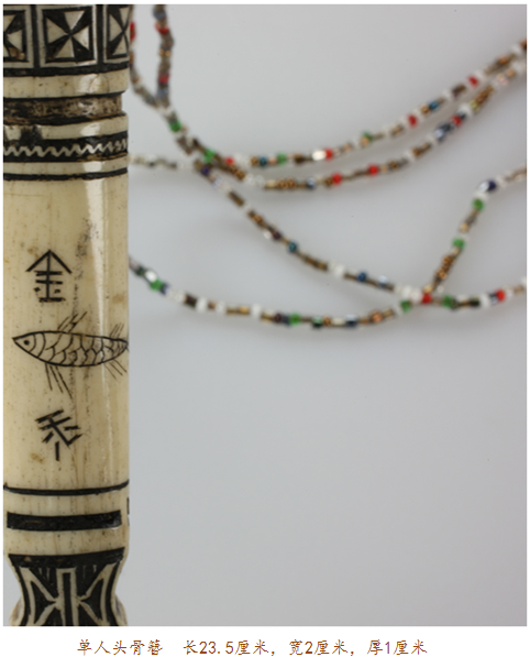 骨簪頭部以下是充滿幾何感的水波紋、山形紋、米字紋、圓形紋,留白之處有魚紋、花紋以及少許文字。文字或是雕刻者本人,或是其心愛之人。一般頭像處或中部系有幾束彩色料珠的紅纓穗飾物用以盤繞發(fā)髻上,或是以銀鈴、銀片來(lái)裝飾。