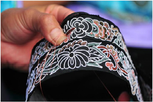 第四步是刺繡,包括三個環(huán)節(jié),即固定框架圖案、填芯和鑲邊。固定框架圖案,即用一根大針將馬尾線穿好,再用另一根稍小的針穿上同色絲線,然后一邊用馬尾線在布面上鑲成各種圖案,一邊用穿有絲線的小針將圖案固定在布面上。填芯,即用各色絲線將固定好的圖案空隙部分填滿。鑲邊,即用橙色和黑綠色絲線在四周挑繡成鑲邊圖案。