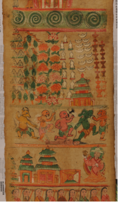 納西族東巴教的長幅布卷畫,通稱為“神路圖”,它是東巴教繪畫中的巨作。此類畫一般長10-20米,寬1尺左右,有“古代宗教繪畫第一長卷”之譽(yù)。文化內(nèi)涵異常豐富,在國際學(xué)術(shù)界被視為宗教繪畫一絕。如今,此畫已成稀有之物。很少見到尚留存民間的神路圖了?!吧衤贰敝鉃闁|巴為死者評斷、指點(diǎn)通往神地之路,把他們從地獄的煎熬中解脫超度出來,轉(zhuǎn)生為人,送至神靈之地。在納西族的喪葬和超度亡靈儀式上,根據(jù)神路圖導(dǎo)引死者靈魂進(jìn)入新的生命場是一件極為重要的大事。到時,要把神路圖展開,眾東巴站于圖旁依次詠誦8冊《神路圖經(jīng)》,為死者評斷路徑,導(dǎo)引亡靈穿越鬼地;擺脫惡鬼的種種折磨。在納西族實(shí)行傳統(tǒng)安葬習(xí)俗時,要在安葬場鋪開神路圖,把圖上的鬼地部分朝著死者頭部,向東北方向鋪開。往東北方向鋪的意思是死者靈魂將回歸東北方向的納西遠(yuǎn)祖之地。把死者靈魂送到“祖先之地”是納西族的古代民俗。各地納西族都有十分詳細(xì)的送魂路線,靈魂返祖地必經(jīng)的每一個地名都在口傳和寫于東巴經(jīng)的送魂路線中標(biāo)出。其畫面所繪鬼神人三界有數(shù)百個人神鬼獸的形象和很多具有宗教象征意義的物象,有佛像、神像、各種動物神,七八十個奇禽異獸以及東巴跳神的舞蹈布局,畫卷內(nèi)容以靈魂不滅,因果報應(yīng),生死輪回等佛教信條為指導(dǎo),用連續(xù)性和富有戲劇性的畫面表現(xiàn)人死后亡魂不滅。
