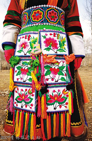 隨著時代的更替,土族女性的服飾發(fā)生了很大變化,有的傳統(tǒng)服飾已消失,有的服飾經(jīng)過推陳出新,重放光彩。如舊時的繡花高領,如今變成直翻兩用領;蓋在“扭達”上的長頭巾——“扭達爾秀巾”,變成了今日土族女性使用的短頭巾?,F(xiàn)今,廣大土族女性,不僅喜穿本民族服飾,而且還愛著時尚服飾,她們或使土族服飾時裝化,或使時裝土族服飾化,豐富了土族的服飾文化。