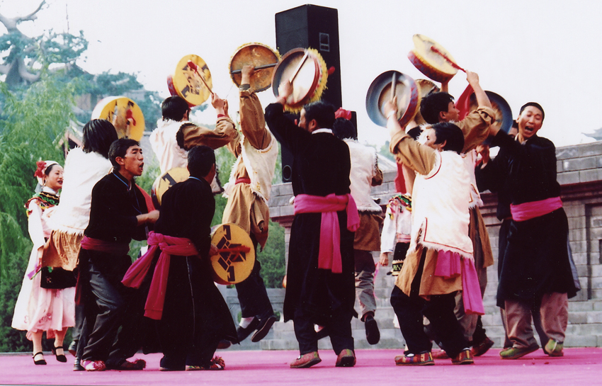 羊皮鼓舞是羌族重要的舞蹈形式。羌族人每遇病、喪之事,都要請巫師跳皮鼓。巫師一般為2人,1人舉短戈在前,1人左手持單面鼓,右手持彎把鼓錘敲擊,并搖晃鼓內(nèi)的小鐵環(huán)嘩嘩作響,開始在一陣吆喝和鼓聲震天的熱烈、緊張氣氛中邊擊鼓邊跳,走步時腳不停的顫動,帶有神秘感。主要步法有:甩鼓步,兩腳八字分開,鼓先落在兩胯之間,然后向上甩,同時擊鼓。兩邊踮跳步,前腳向前跳,后腳以腳尖點地跟出,左右交換擊鼓。還有開胯下蹲跳步、松膝繞步等。也有原地打“旋子”的技巧動作,其動作節(jié)奏明快,激烈而敏捷。一般在老年人死后,跳皮鼓要進(jìn)行3天3夜,死者的親朋故友都要參加跳皮鼓,人數(shù)不限,跟在巫師身后,從右到左,或由左到右地跳動。先成曲線隊形,然后成圓圈。跳皮鼓以表演者手中所持羊皮鼓、串鈴等為伴奏,鼓點種類繁多,相傳過去跳皮鼓的鼓點曾有108種之多。