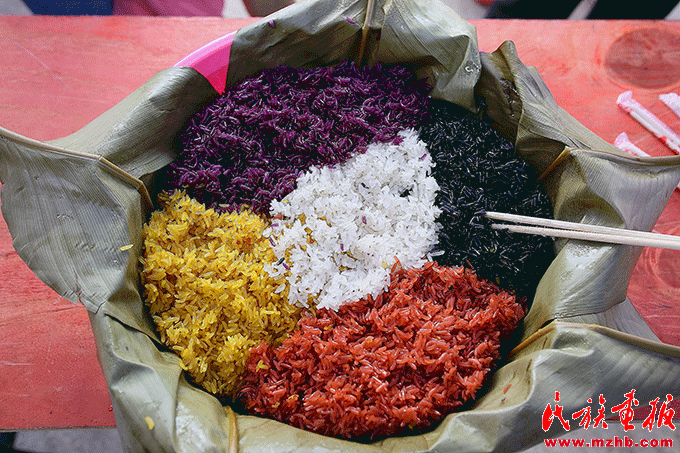 南方稻作民族將糯米用紫蕃藤、黃花、楓葉、紅藍(lán)草等泡染后再蒸煮出紅、黃、黑、白、紫的五色糯米飯,五色糯米飯一般在重要的節(jié)日中食用,以求吉祥。李琳攝影 引自民族畫報(bào)