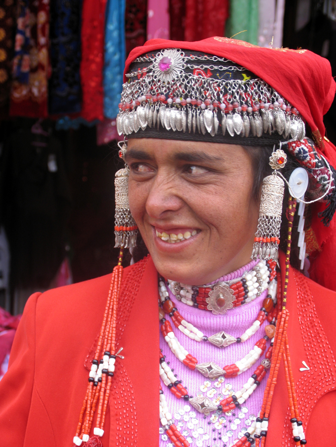 塔吉克族婦女服飾的顏色艷麗而奪目,大多數(shù)會(huì)以紅色為主,她們喜歡穿連衣裙,并在裙邊、領(lǐng)口、袖口上繡以美麗的花紋或者圖案,還喜歡用耳環(huán)、項(xiàng)鏈、手鐲等首飾來(lái)裝扮自己。她們十分講究頭飾和帽子,有一種青年婦女的圓形花帽上會(huì)嵌鑲金、銀片和各種珠子,帽子前沿會(huì)裝飾一排色彩鮮麗的珠子、銀鏈。婦女著裝時(shí)帽沿上會(huì)加綴一排小銀鏈,在塔吉克語(yǔ)中稱(chēng)為“斯拉斯拉”,戴著大耳環(huán),脖子山會(huì)繞數(shù)道項(xiàng)鏈,胸前還會(huì)佩戴被稱(chēng)為“阿勒卡”的圓形大頭飾。通常情況下,已婚婦女會(huì)在發(fā)辮上綴飾白紐扣,新娘也會(huì)在發(fā)辮上飾以絲穗,以求美觀。在塔什庫(kù)爾干,打扮得花枝招展的塔吉克婦女隨處可見(jiàn),猶如從天上云彩中下凡的仙女。塔吉克族已婚婦女的裝束也十分吸人眼球,她們外出時(shí),會(huì)在帽子外披上頭巾,迎風(fēng)走來(lái),頭巾隨風(fēng)飄揚(yáng),別有一番風(fēng)度。