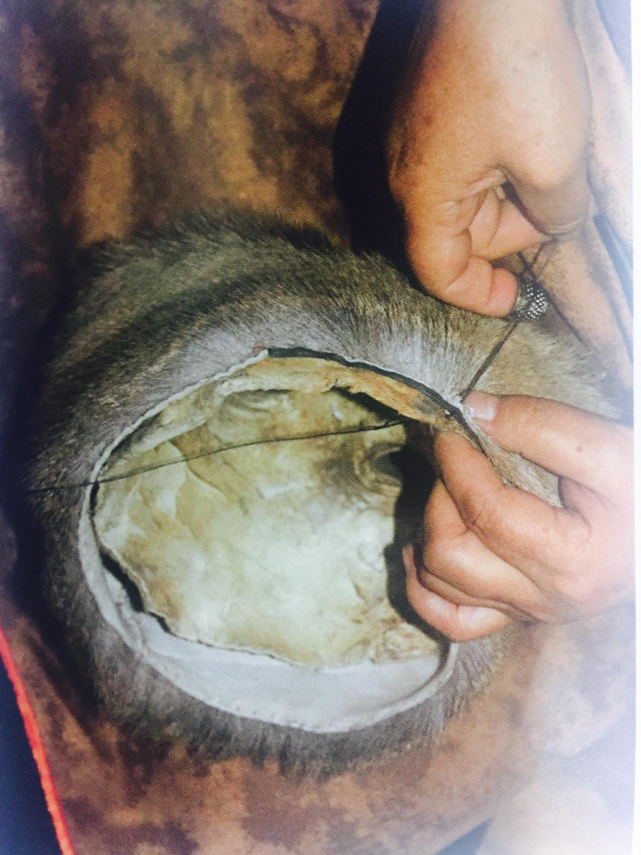 狍角帽是用整狍子的頭顱,去掉骨肉后,保留狍頭上的毛、角、耳朵、鼻子和口,精心鞣制而成。主要制作流程是:剝皮,清洗、熟皮,定型,補(bǔ)眼睛、刺繡、制作繡片,縫合護(hù)耳與頭皮,制作里襯。制作時(shí),如何剝得完整的頭皮,是整個(gè)制作環(huán)節(jié)的關(guān)鍵。