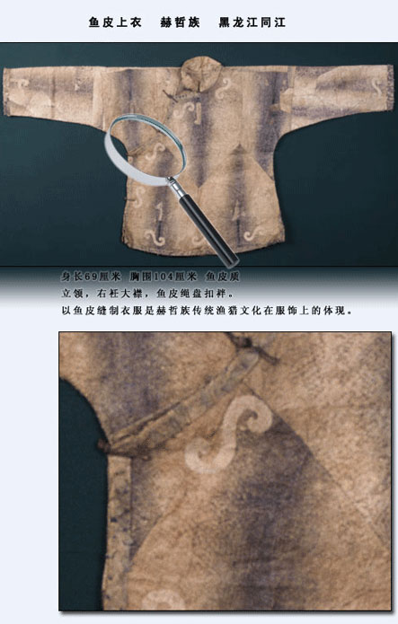 赫哲族的魚(yú)皮衣歷史久遠(yuǎn)。我國(guó)古代文獻(xiàn)《山海經(jīng)》第九卷《海外東經(jīng)》中便有“玄股之國(guó),在其(黑齒)北,其為人衣魚(yú)食鷗” 的記載?!耙卖~(yú)”西晉學(xué)者郭璞解釋為“以魚(yú)皮為衣也。”說(shuō)明早在兩千多年前,赫哲族的先民就已使用魚(yú)皮做衣服了。另?yè)?jù)密山新開(kāi)流新石器時(shí)代遺址中出土的魚(yú)叉及骨針,證明赫哲族的先民捕魚(yú)和縫制魚(yú)皮衣有數(shù)千年歷史了。清代張晉彥的《寧古塔山水記》有:“魚(yú)皮部落,食魚(yú)為生,不種五谷,以魚(yú)皮為衣,暖如牛皮”的記載。《皇清職貢圖》記載:“赫哲衣服多用魚(yú)皮而緣以色布,邊綴銅鈴,亦與鎧甲相似?!绷硗?,地方志書(shū)對(duì)此也多有記載。可見(jiàn),赫哲族制作和穿著魚(yú)皮衣是真實(shí)而久遠(yuǎn)的。