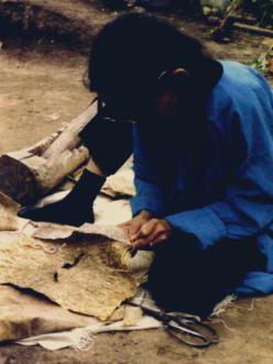 圖八 圖九 赫哲族婦女用木鍘刀熟魚(yú)皮 將熟好的魚(yú)皮連成大片
