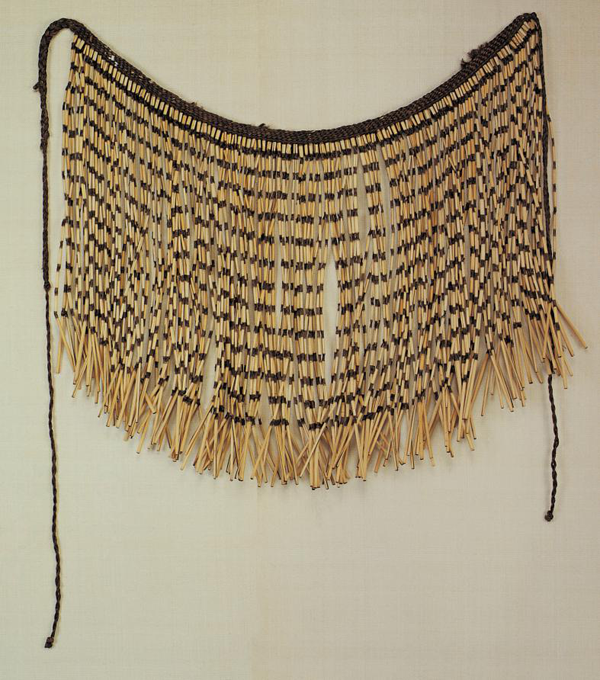 博嘎爾婦女穿一種叫“基都”的短上衣。用野麻織成的土布縫制,其樣式為無領(lǐng)、短袖、對(duì)襟。下部穿用羊毛織成的粗呢緊身筒裙,稱作“結(jié)邦”。小腿部扎裹腿,叫“涅蘇木”。條件好的人家外面還會(huì)罩一件稱為“階納布”的披肩。希蒙部落的婦女穿當(dāng)?shù)孛藁棾傻陌咨蛩{(lán)色的寬大對(duì)襟短上衣。下身穿筒裙,裙子下擺較寬,上面織有黃紅色或黃黑色的簡(jiǎn)單圖案(圖為民國時(shí)期的珞巴族草裙,中央民族大學(xué)民族博物館館藏)。