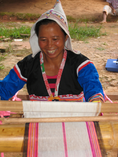 基諾族織錦色線的染色工藝有其獨(dú)特之處。染黑(青)布,采“咪叭”(即板藍(lán)根)鮮葉泡化去渣,加入石灰水?dāng)嚢璩浞趾蟿?,煮水,把布投入水中翻?dòng)多次,撈出曬干即可,煮泡越透色越深。若染青色,只要浸泡一會(huì)即可。染黃線,采“合詩(shī)阿波”花(鼠鞠草)與線同煮即可。染綠色,采一種藤“阿紐克帕”和一種樹(shù)“資奪帕”的鮮葉與線同煮,加石灰水少許即可。染紅線,用“阿納切”樹(shù)根、“樸臘突”樹(shù)皮和紅高粱殼,加石灰水與線同煮即可。