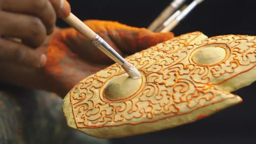 在等待膠布面具晾干的時(shí)候,扎西去到了兒子練習(xí)跳舞的地方,在外面遠(yuǎn)遠(yuǎn)的看著兒子練舞。原本希望兒子繼承他這手藝的心思,在看到兒子真心喜歡藏舞后,也被漸漸放了下來?;氐郊抑校z布面具已經(jīng)干透,開始了制作面具中最重要的一環(huán):上顏色。隨后上頭發(fā)、簪子等小零件,一個(gè)薩迦面具終于制作完成。