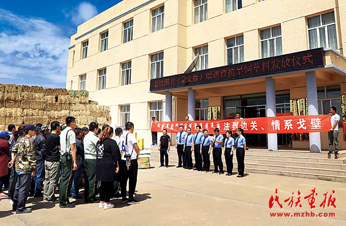 阿拉善盟檢察分院的“法到邊關(guān)、情系戈壁”《普法宣傳教育叢書(蒙古文)》贈(zèng)送暨抗旱救災(zāi)飼草料發(fā)放儀式。