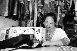 廣西柳州市融水苗族自治縣苗家小鎮(zhèn)是一個易地扶貧搬遷社區(qū),自2017年群眾陸續(xù)入住以來,當?shù)卣诩訌姾屯晟苹竟卜?wù)設(shè)施的同時,通過創(chuàng)辦扶貧車間、成立小微市場和鼓勵自主創(chuàng)業(yè)等方式,多措并舉保障和提升搬遷群眾的就業(yè)質(zhì)量,目前已實現(xiàn)“一戶一人就業(yè)”共1586戶3824人,占總戶數(shù)的98%。搬出大山的群眾迎來了新的生活,開啟了新人生。蒙瓊丹是融水縣桿洞鄉(xiāng)桿洞村搬遷戶,她在照顧兩個小孩讀書的同時開了家苗衣店,月收入2000元。圖為8月30日,蒙瓊丹在制作苗族服裝。 龍濤攝影報道