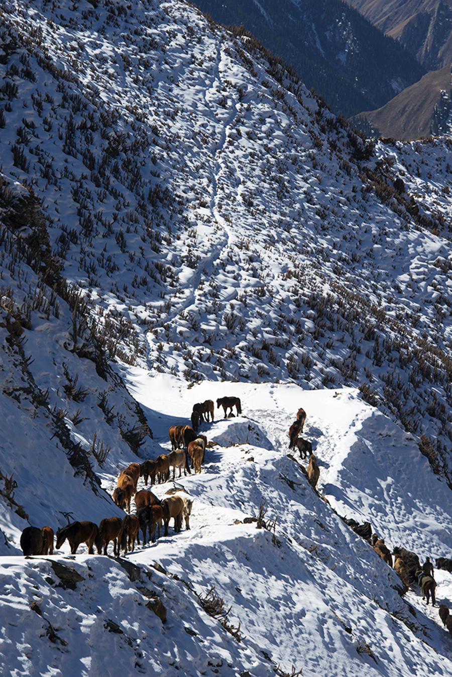 喬隆格爾冬牧場(chǎng)與山外的氣候差異大,暖陽(yáng)如春。另一個(gè)突出特點(diǎn)是草好,草密的地方?jīng)]膝,縱橫倒伏一片,比南方秋田摞在一起的蒲草都密實(shí)。空氣清洌,腐草味兒、上一年遺留的畜糞味兒和著遠(yuǎn)處高大冰崖透散過(guò)來(lái)的寒氣撲面而來(lái),最突出的還有野生動(dòng)物的腥氣,牧羊犬夜夜不停地叫聲在告訴你它們往復(fù)經(jīng)過(guò)的頻率。山上能看到大角的北山羊,野鵪鶉被驚到嘩啦啦地飛起一片。若是誰(shuí)家的羊死了扔在野外,幾天都能看到禿鷲在天空盤(pán)旋。最不可思議的是雪豹,光顧一次造成的損失遠(yuǎn)比一群狼大。
