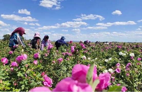 在阿舍鄉(xiāng)清香玫瑰合作社的玫瑰花茶基地里,玫瑰花姹紫嫣紅,爭奇斗艷,美不勝收。為了搶抓玫瑰花采摘最佳時(shí)間,花農(nóng)早晨5點(diǎn)多就已經(jīng)忙活起來,他們穿行于花海之間,背著籮筐興高采烈地采摘今年的第一波玫瑰花。