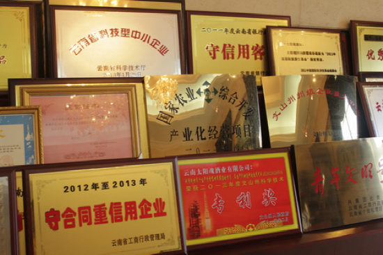 十幾年的風(fēng)雨兼程,太陽魂酒業(yè)有限公司榮膺多項(xiàng)殊榮,先后獲得“云南省農(nóng)業(yè)產(chǎn)業(yè)化省級龍頭企業(yè)”、“云南省農(nóng)產(chǎn)品加工重點(diǎn)企業(yè)”、“全國休閑農(nóng)業(yè)與鄉(xiāng)村旅游示范點(diǎn)”、“云南省著名商標(biāo)”、“云南省省級企業(yè)技術(shù)中心”、“2009中國(昆明)酒業(yè)發(fā)展高峰論壇暨新中國60周年云南酒業(yè)十大功勛品牌”及“云南酒類消費(fèi)市場十大最具成長性品牌”、“云南省接待用酒”等榮譽(yù)稱號。已獲得QS認(rèn)證、ISO9001認(rèn)證,HACCP認(rèn)證等高標(biāo)準(zhǔn)企業(yè)資格證書。產(chǎn)品質(zhì)量達(dá)到國內(nèi)先進(jìn)水平,釀制的“赤霞珠”葡萄酒獲2006年亞洲葡萄酒質(zhì)量大賽金獎、北京國際葡萄酒暨烈酒挑戰(zhàn)賽銅獎和第八屆中國國際葡萄酒及烈酒評酒會上榮獲銀獎,梅里圣地冰酒榮獲2006年亞洲葡萄酒大賽銀獎、2012年亞洲質(zhì)量大賽金獎及領(lǐng)袖產(chǎn)區(qū)代表產(chǎn)品。朗姆酒2011年榮獲“2011中國(蓬萊)國際葡萄酒?烈酒品評賽”銀獎。2011年國際釀酒師葡萄酒烈酒大賽中獲得銀獎,2012年獲得國際釀酒師葡萄酒烈酒大賽金獎。2012年,公司釀造的赤霞珠產(chǎn)品被法國勃艮第大學(xué)葡萄酒學(xué)院指定為教學(xué)用酒。2013年7月,“梅里圣地赤霞珠冰酒”榮獲2013中國優(yōu)質(zhì)葡萄酒挑戰(zhàn)賽金獎。同時(shí),公司位于德欽產(chǎn)區(qū)的干紅及冰酒已通過有機(jī)產(chǎn)品認(rèn)證。2014年“2012梅里冰酒”榮獲國際領(lǐng)袖產(chǎn)葡萄酒(中國)質(zhì)量大賽優(yōu)質(zhì)獎,拍品價(jià)格1萬元。