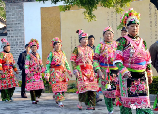 男子頭頂氈帽(又稱氈窩),穿大襟衣、大襠褲,赤足或穿草鞋,披羊皮,外出背皮袋(現(xiàn)已基本消失)。女子裹高包頭、額上飾銀桂花,衣為布襟,外套坎肩,腰系大圍腰,大圍腰左右下三邊繡五色花,為動植物圖案,足穿繡花鳳頭鞋,用本地產(chǎn)綠布條制褲子,不鎖腳邊,腰間背圓形白氈裹背,所穿服飾顏色鮮艷、質(zhì)地厚重,盡顯遠古南詔皇室服飾遺風。