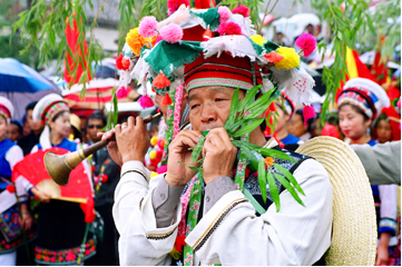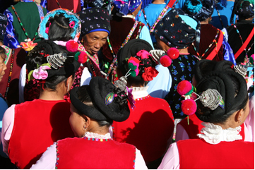 新娘的首飾主要由耳環(huán)、銀鐲、針筒銀鏈和戒指等構(gòu)成,其中銀質(zhì)手鐲和針筒銀鏈大都出自本地工匠之手。主要是因為在鶴慶以北的新華村早就是聞明世界的制銀之鄉(xiāng),銀手鐲一般分為“細絲”、“粗絲”和“粗夾細”三種。細絲就是用較細的銀絲(直徑0.1厘米)制作成直徑為l.5厘米的繩狀手鐲;粗絲則用0.2厘米銀絲做成;粗夾細是用上述兩種銀絲混合制做而成的。銀手鐲式樣的選擇取決于新娘的喜歡。而針筒銀鏈長40厘米,它是由l2條銀鏈排列組合,在銀鏈的中段有“石鎖”狀的飾物連接下部,銀鏈下端綴有栩栩如生的十二生肖屬相,針筒銀鏈掛在胸的左前側(cè),但也有掛紅色或綠色方巾的,即實用,又能起裝飾作用。耳環(huán)、戒指和玉鐲等其它飾件一般由自己準(zhǔn)備,但也有親友贈送的或是由婆家送的。整套服飾有容華貴,明快之中顯素雅,繡艷之中見端莊。