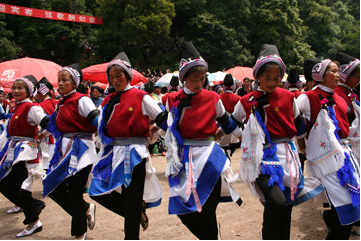 以大理市為主要代表的洱濱區(qū)白族服飾。如周城、喜洲、挖色等白族服飾,他們世代伴水而居,生活環(huán)境十分優(yōu)越,服飾給人一種清新明快的感覺。在很大程度上折射出這種環(huán)境的優(yōu)越性,周城村白族男服飾過去的穿著較為復(fù)雜,纏白布包頭,上衣穿立領(lǐng)對襟布紐衣,俗稱“三滴水”,最里的一件穿白色、中間一件穿藍色、最外一件穿黑色或是藏青色的外衣,三件衣服都是敞開著,露出內(nèi)穿的兜肚,外穿一件麂皮或山羊皮的領(lǐng)褂,下穿白或藍色大襠褲,腳穿布底剪口鞋。肩掛繡花掛包。而現(xiàn)在的男裝基本與漢族相同,平時需要穿戴的民族服裝也是改良過較為簡潔的男裝,只有在重大節(jié)日的時候才能看到傳統(tǒng)的著裝風(fēng)采。而女裝的穿戴至今還保持得較為完整,以白、藍兩色為主,沿承了白族崇尚白色的傳統(tǒng)特點,上身穿白色緊袖裳,外套紅或藍色右衽領(lǐng)褂,在領(lǐng)褂的紐扣上掛三須或五須銀鏈,銀鏈上綴掛件,有銀質(zhì)的針筒、魚、牙簽、耳勺。手戴金、銀或玉手鐲、戒指。耳戴金、銀耳墜。手袖上套滾邊的大袖小袖,并在袖上鑲各式花邊。腰系繡花短圍裙或系凈白色底外鑲一圈黑色邊的素面短圍腰。下穿白或藍色滾邊長褲,褲腿邊鑲寬窄花邊,花邊上面繡各類花卉圖案。腳穿繡花尖鞋,又名“白姐鞋”(“柏姐鞋”),鞋面為紅、粉、綠、黑等色,繡有艷麗的花紋。頭飾和過去的頭飾相比較從美術(shù)的角度上看要美得多,特別是姑娘的頭飾,過去傳統(tǒng)頭飾一般喜戴魚尾帽,還有我們在電影《五朵金花》中所看到過的姑娘頭飾,而今姑娘的頭飾讓人一看就聯(lián)想到大理的“風(fēng)花雪月”四大美景。頭戴色彩鮮艷的繡花頭巾,繡花頭帕上端精心梳理出茂密雪白的絨毛,形象的表現(xiàn)了蒼山頂上的皚皚白雪,將發(fā)辮盤繡花頭帕外,纏以大紅絨線,形如滿月,一側(cè)垂下雪白的纓穗飄飄灑灑,象征著終年吹拂的下關(guān)風(fēng)。整套服飾在很大程度上折射出這種環(huán)境的優(yōu)越性,如色彩搭配對比鮮明,簡潔明快,挑花精美,毫無細碎之感,裝飾繁而不俗等。
