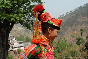 云南巍山彝族回族自治縣各民族如壯麗的織錦,將生活裝扮得五彩繽紛,充滿詩情畫意。其中特別是東山一帶的彝族服飾色彩較為豐富,款式變化多姿,并且以大量的銀制品和刺繡裝飾,制作工藝之精良,堪稱少數(shù)民族服飾一絕。以小孩帽而言,就有魚尾帽、小瓢帽、銀鼓帽、花帽和搭耳帽等數(shù)十種,名目繁多,式樣各異。帽子上都繡有花草、樹葉、龍鳳圖案,鑲嵌著閃亮的銀首飾,十分逗人喜愛。小孩的衣服式樣也很多,大多由紅、藍、綠、白幾種顏色的布料縫制而成,紅綠交織,藍白相襯,非常艷麗。如花朵一般的彝族少女通常頭戴銀鼓帽,墜耳環(huán)、身穿藍領(lǐng)褂,腰系花圍裙,下著綠彩褲,背掛圓裹背。銀鼓帽和繡花鞋做工極為精巧,全套裝飾花團錦簇,恰似一只開屏的孔雀。結(jié)婚后的婦女就不再戴帽子,改為結(jié)發(fā)髻,裹包頭。發(fā)髻一般呈寶塔狀,外裹黑紗和黑布包頭,發(fā)髻上戴“別子”。“別子”其實就是發(fā)卡,均為銀制品,分為四串,每串有兩個燈籠繡球,兩個響鈴和兩尾小魚。包頭巾外再用銀串珠、亮球飾之。上衣著右衽大襟,前短后長、領(lǐng)、袖及襟邊則鑲以多層不同的金銀絲瓣或自繡花紋的多層寬窄不同的花邊。外罩齊腰藍布短領(lǐng)褂,領(lǐng)口上安裝著七個用銀鼓釘湊成五個葉子,狀如葵花形,彝語叫“披巴”的裝飾。領(lǐng)褂四周皆用銀鼓釘鑲邊,共四排,每排36顆。一件領(lǐng)褂上需有兩百多顆銀鼓釘,加上胸前佩戴銀制的“三須”針筒,“菱角吊”串珠和雞心型繡花荷包,整個裝飾真是銀裝素裹,分外嬌嬈。腰間系的圍腰布上,鑲嵌多層金銀絲瓣或自繡圖案的花邊。圖案有串枝蓮、牡丹花、太陽花及鳳戲牡丹、丹鳳朝陽等。無論未婚和已婚婦女,背上都有一個用羊毛搟制而成的圓型繡花裹背,直徑約一尺不等,內(nèi)外兩層,中可承物,上繡兩對太陽花,一大一小,對稱排列。裹背除用作裝飾外,還可保護腰部,既有欣賞價值,又有實用價值,這在巍山彝族服飾中是最為典型的一件飾物。銀鼓帽繡有42朵小花,鑲有96顆銀鼓釘,帽頂插有花一朵或釘有櫻花一束。其帽形如金魚,魚頭魚身為帽,魚尾多岔分為護頸,亦稱為“魚尾帽”。繡花鞋呈船形或鳳頭形,鞋面繡有40余朵小花,紅色中夾有40余片綠葉。如果是新娘鞋,則用紅色或粉色的軟鍛做鞋面,更為講究。