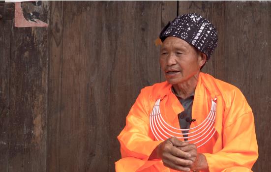 谷灑村的苗族為背牌苗,當(dāng)?shù)赜肿苑Q高坡苗。背牌苗的得名,來源自背牌苗的服飾。背牌苗男子服飾分為兩種,一種是鬼師服飾。鬼師服飾為橘黃色斜襟長衫,胸前帶銀項(xiàng)圈,頭部帽子是用帶有白色圖案的黑色布帶圍繞頭部而成。