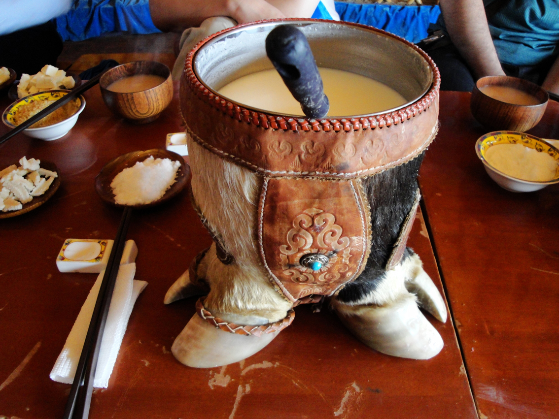 奶茶(蒙語叫“蘇臺(tái)柴”)是蒙古民族日常飲用的一種茶,也是蒙古人民招待客人的必備飲料。其做法,一般是將磚茶放入鍋內(nèi)熬成紫紅色,然后將鮮奶(除常用的牛奶外,還用羊奶或駝奶)大致以六比一的比例放入茶水中熬開,即成。隨其所好,可加鹽或加糖。奶茶營養(yǎng)豐富,具有提神、開胃、助消化、解渴等功效。