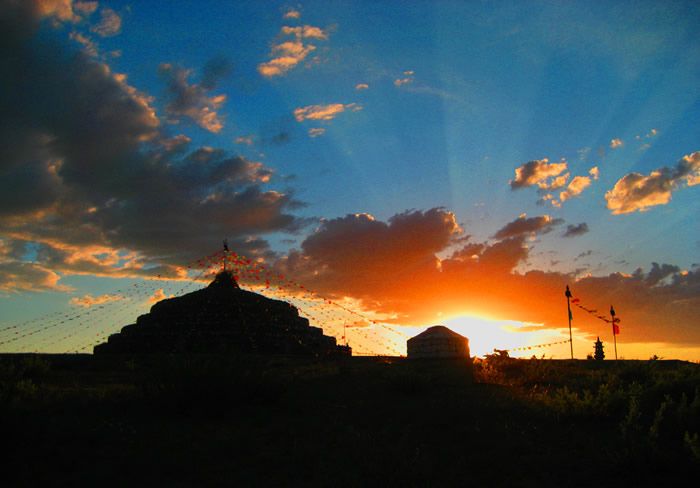 旅游中心所祭祀的“格根查干敖包”,原本屬于本土牧民祭祀的古老部落扎薩克敖包,曾經(jīng)由博教(薩滿教)大師開光,后來的佛教高僧對(duì)這座敖包又融入了符咒,實(shí)屬擁有“靈性”的正宗敖包。旅游中心為了充分展示遠(yuǎn)古敖包文化的魅力,按照蒙元時(shí)期形成的敖包規(guī)則予以拓展,即以故有的敖包為核心,由12座統(tǒng)一的小敖包,分布于規(guī)則的圓周線上,簇?fù)碇黧w敖包。蒙古族歷來崇尚數(shù)字的“13”,認(rèn)為這個(gè)數(shù)字既是成功的起點(diǎn),又是萬事大吉的象征。這種由“13”組合而成的敖包寓意深刻,“10”是一個(gè)整數(shù),有整合之意,“3”是一個(gè)全數(shù),即代表著天、地、人的統(tǒng)一體,象征著完美無缺的蒼天之力。源于遠(yuǎn)古時(shí)期的博教,根據(jù)其長生天學(xué)說“上蒼有99重天,下有人間輪相屬年和諧共存”之理念,主體敖包的石壁上制有祭典長生天的99盞燈座,體現(xiàn)著其三元結(jié)構(gòu)的完美與蒙元時(shí)期正宗敖包的風(fēng)采和神威。