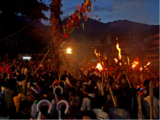白族視火為生命與靈魂的護(hù)佑物,古有火崇拜習(xí)俗,火把節(jié)是白族對(duì)“生之禮贊和死之緬懷的節(jié)日”。火把節(jié)這一天,各村由年內(nèi)新添子嗣之家作“會(huì)首”,在場壩中豎一高大的火把,常年扎十二臺(tái),潤年扎十三臺(tái),頂端扎升斗旗幟,上書“風(fēng)調(diào)雨順”、“五谷豐登”字樣,下懸花紅、梨子、銅錢等物。天擦黑點(diǎn)燃火把,會(huì)首們以糖果、炒蠶豆、煙、茶、酒招待相聚在場壩中的老小。兒童則一手持小火炬,一手往火炬上撥灑松脂粉沐相戲,對(duì)新生的嬰兒表示致賀禮贊。與此同日,新亡故者之家人須上墳祭祀,在新故者墳前或大門口豎一小火把,如是者三年,表示對(duì)死者的緬懷,與史書“星回日祭祖”的記載相合。