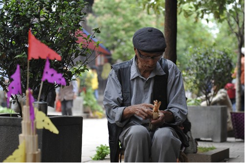 早上十點(diǎn)左右,火把就快扎好了。色彩鮮艷的紙裱斗升上各色卷著的彩旗正一個個被打開,梨、蘋果、花紅正被栓成一串串地掛在樹枝上,水泥桌上擺著小旗、炒蠶豆和糖果等,老人們在一旁邊笑邊聊,一盤彩色米干在燦爛的笑著。