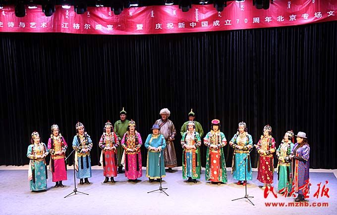 2019年11月11日,第二屆“史詩與藝術(shù):江格爾盛宴(論壇)”暨慶祝新中國成立70周年北京專場文藝晚會在北京民族文化交流中心魚與劇場舉行。晚會分為新疆蒙古族服飾表演、民歌、史詩、民俗表演4個單元,來自新疆阿勒泰、塔城、博爾塔拉、巴音郭楞等地州的105名民間藝人為首都觀眾獻上了一場原生態(tài)視聽盛宴。