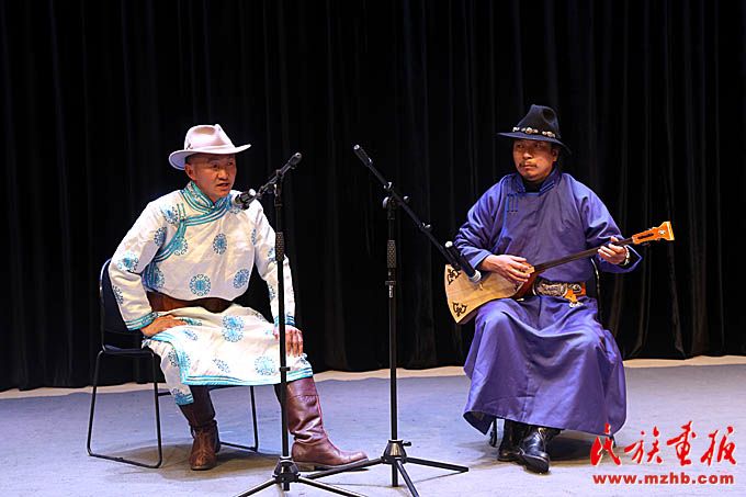 和布克賽爾蒙古自治縣江格爾傳承人(左)表演《江格爾說唱》。