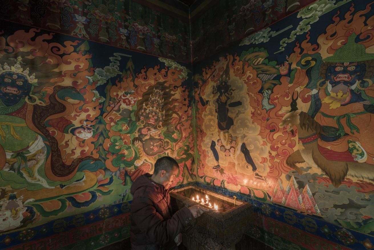 西藏壁畫(huà)分布在寺廟、府第、宮殿、民宅、驛站、旅店等地方的墻壁上。而寺院則為壁畫(huà)聚集之所,大寺院往往有數(shù)十個(gè)到數(shù)百個(gè)殿堂,各個(gè)殿堂及其周圍走廊的墻壁、天花板等處均繪滿了壁畫(huà),如果把這些壁畫(huà)一幅幅地排列起來(lái),那確實(shí)是延綿不斷、絢麗多姿、色彩繽紛的美麗畫(huà)廊。
