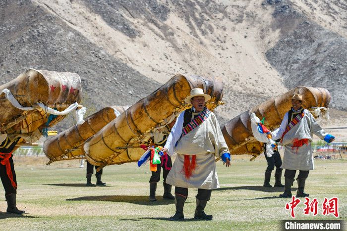 資料圖為西藏拉薩曲水縣俊巴漁村村民穿著盛裝表演牛皮船舞。 記者 貢嘎來(lái)松 攝