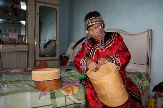 鄂倫春族素有“白樺民族”之稱,白樺樹皮制品種類非常多,大到可以乘人載物的樺皮船、圍蓋“仙人柱”的“鐵克沙”,小到可以裝在衣兜里的煙盒和含在口中的狍哨,提水用的桶、采集用的簍、裝物用的箱、盛飯用的盆、吃飯用的碗、喝酒用的蠱等等。樺樹皮制品的裝飾圖案可以通過壓劃、壓?。c(diǎn)刺)、剔刻、烙燙、補(bǔ)花、繪畫等多種方法形成。壓印點(diǎn)刺是最常用的裝飾手段,工具是用獸骨制成的,分單齒、雙齒、多齒和簡(jiǎn)單幾何形幾種。先在剪裁好的器物材料上,用壓、打等方法點(diǎn)刺出裝飾紋樣,再縫合成器物成品。這種裝飾多為素面凹形花紋,顯得樸實(shí)單純,而且器物越陳舊樺皮顏色越深,越有光澤,圖紋越清晰。也有人在壓打線上著色,這便形成了另一種風(fēng)格,美觀艷麗而且突出了物象特征。