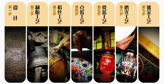 一件景泰藍(lán)成品需要歷經(jīng)設(shè)計、制胎、掐絲、點藍(lán)、燒藍(lán)、磨光、鍍金七大步驟,近百道工序,十幾個工匠三個月的時間純手工方能完成。景泰藍(lán)既運用了青銅工藝,又吸收了瓷器工藝,同時大量引進傳統(tǒng)繪畫和雕刻技藝,是集冶金、鑄造、繪畫、窯業(yè)、雕、鏨、錘等多種工藝為一體的復(fù)合性工藝過程,堪稱集中國傳統(tǒng)工藝之大成,因而自古便有“一件景泰藍(lán),十箱官窯器”之說。