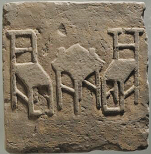 邊長(zhǎng)20.5厘米,厚5厘米,呈正方形。駱駝構(gòu)圖充滿整張畫面。雙峰駝呈臥姿,頭部昂起,似乎是在傾聽什么,韁繩拴在木樁上,像是在等待主人拿來美味的草料。駱駝造型比例恰到好處,生動(dòng)傳神。