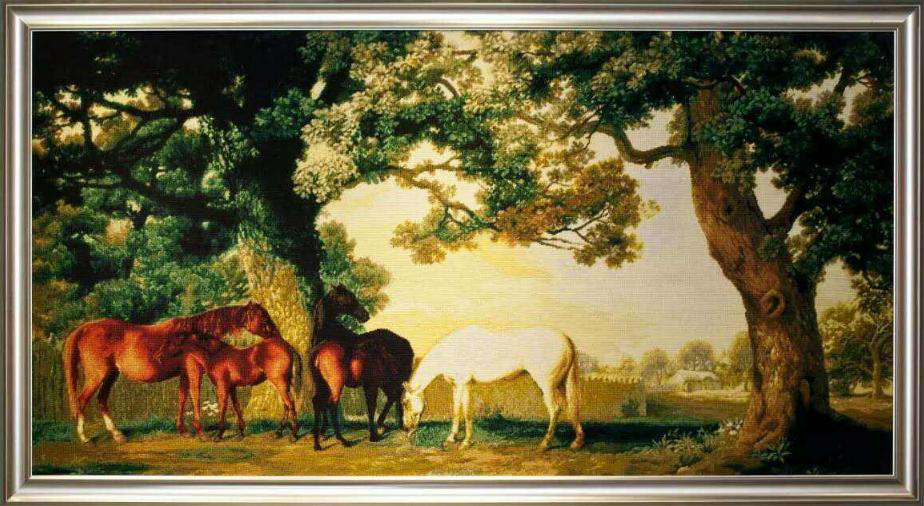 一般畫(huà)面較大,多數(shù)復(fù)制名畫(huà)、人物和風(fēng)景照片。用線(xiàn)顏色往往達(dá)數(shù)百種,特別強(qiáng)調(diào)色階、色相的過(guò)渡,并注重人物神態(tài)的刻畫(huà)。作品常作為大型建筑的室內(nèi)裝飾。