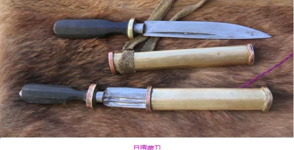 旦嘎藏刀在西藏是比較有名的,刀身是以鋼材鍛制而成,通過手工精心加工,刀刃鋒利,刀面凈光。規(guī)格為短刀和小刀兩種。短刀約四十厘米左右,小刀則僅有十幾厘米長,具有很強的地方特色,主要是防身和日常生活中吃肉為主。刀把多用以牛角或牛骨制成,刀鞘多數(shù)是包黃銅、白銅,還有白銀,上面一般沒有圖案,也沒有鑲嵌各種寶石、鍍金等,顯得很別致。