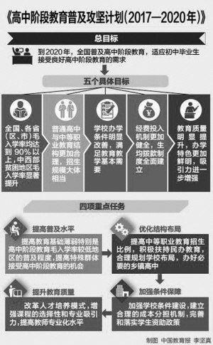 據(jù)中國民族報訊 2017年4月6日,教育部公布《高中階段教育普及攻堅計劃(2017-2020年)》(以下簡稱《攻堅計劃》)?!豆杂媱潯诽岢觯?020年,全國普及高中階段教育。我國高中階段教育毛入學(xué)率將要達(dá)到90%。