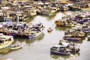 小快船靠上捕魚歸來的大漁船,收購(gòu)、轉(zhuǎn)運(yùn)海鮮漁獲(2014年攝)。