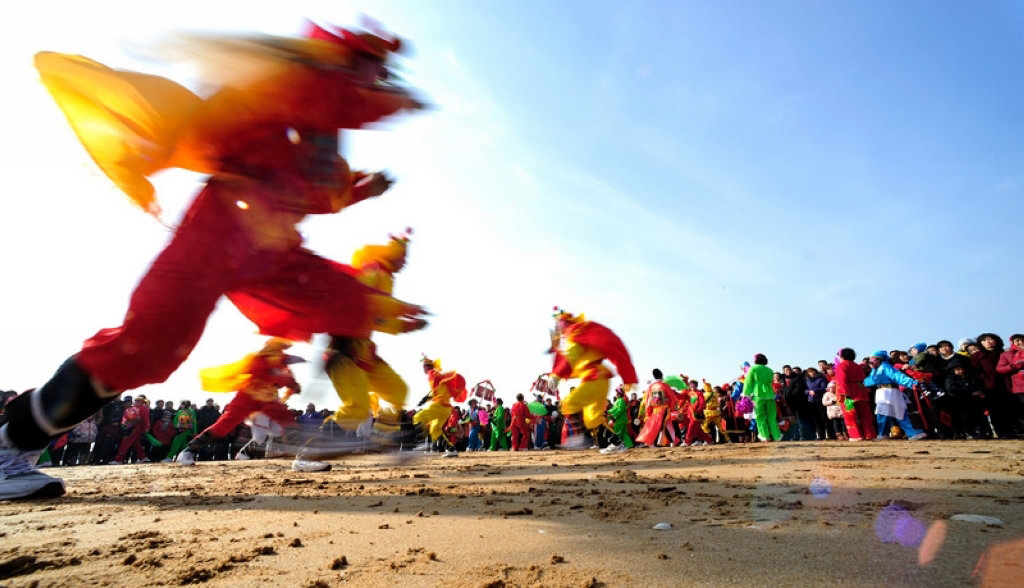 秧歌是春節(jié)群眾歡慶活動(dòng)中,起著承前啟后、烘托氣氛的大型歌舞形式。這里所指的“秧歌”不僅是單一的“秧歌舞”,而是包含著數(shù)十種歌舞形式所組合的文藝演出隊(duì)伍。這支隊(duì)伍既要在走街串巷中做行進(jìn)表演,又將最后集中于廣場(chǎng)做正式的歌舞演出。因此在北方,人們索性就把過(guò)去有著祭祀色彩,而今完全成為春節(jié)娛樂(lè)式的民間文藝形式稱為“社火”或“秧歌”,把這支浩蕩的隊(duì)伍統(tǒng)稱為“秧歌隊(duì)”。秧歌隊(duì)最前方,在高舉象征來(lái)年風(fēng)調(diào)雨順大傘的藝人率領(lǐng)下,“龍舞”“獅舞”舞隊(duì)位列隊(duì)首;接下來(lái)是一組手揮彩綢翩翩起舞,走“雙葫蘆”“繞菠花”各種圖案的“大場(chǎng)”表演隊(duì);然后是腰間橫挎紅色腰鼓、踏著激越鼓聲的“腰鼓隊(duì)”,表演著令人眼花繚亂的“回頭望月”等套路;再后面是腰系竹馬或旱船,扮演新郎送媳婦回娘家的“跑驢”或“跑旱船”;接著是腳踩丈八高蹺、穿戲裝、彩繪臉譜的“高蹺隊(duì)”。接下來(lái)還有名為《火盆架子》的隊(duì)伍,那是把冬季用于取暖的炭盆架,用繩子將其高于腳面懸掛在肩上。盆架以綢布、花草裝飾,表演者戲裝打扮,表演一段段膾炙人口的戲曲節(jié)目。他們被歡天喜地、熙熙攘攘的人們擁簇著一同前往最后進(jìn)行表演的廣場(chǎng)。由各個(gè)村鎮(zhèn)陸續(xù)舉行的這種熱烈而歡騰的歌舞慶祝形式,將貫穿在整個(gè)春節(jié)期間,直到正月十五“燈節(jié)”。