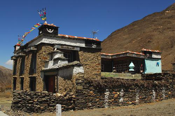 碉房外墻向上收縮,依山而建者,內(nèi)坡則仍為垂直。碉房具有堅(jiān)實(shí)穩(wěn)固、結(jié)構(gòu)嚴(yán)密、樓角整齊的特點(diǎn),既利于防風(fēng)避寒,又便于御敵防盜。