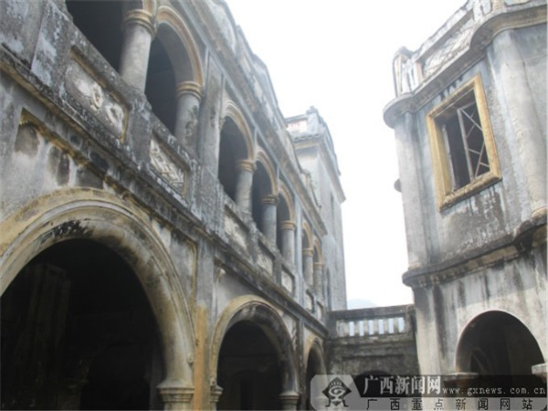 如果說尚德堂是中西混血兒的話,他的兄弟“松柏莊”就是純正的“英國帥哥”。“松柏莊”具有英國新式古典建筑風格,共分為兩層,北面設(shè)有陽臺。陽臺及門窗上部均是圓弧形,用帶有高級的石膏線勾邊。陽臺由數(shù)十條羅馬柱支撐,檐口用西洋線腳裝飾,具有英國新式古典建筑風格。建筑墻體為白色,與墻上“松柏莊”三個黑色大字相映,十分顯眼,盡顯歐式建筑色彩的視覺沖擊效果。老宅有些殘舊,但墻上的雕畫仍然凹凸有致,圖案清晰可見,這無一不表露這家主人曾經(jīng)的輝煌。
