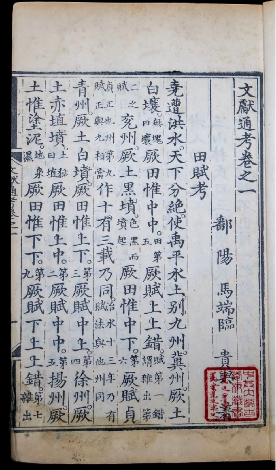 《文獻(xiàn)通考》所述歷代典章制度,上起上古,下至南宋寧宗嘉定末年。該書立目參照《通典》,并有所發(fā)展。全書分為二十四考,每一考前有小序,說明著述的成規(guī),考訂的新意,每考之下又分為若干子目,子目內(nèi)容皆按時間先后排列。撰寫體例是按文、獻(xiàn)、考三個層次排列,凡頂格排行者,即所謂“文”,也就是“敘事”部分。凡低一格排行者,即所謂的“獻(xiàn)”,也就是“論事”部分。凡低兩格排行者,即所謂“考”,也就是作者自己的議論,其內(nèi)容包括指點(diǎn)歷史演變的線索、評判是非、考辨史料和解釋名物等。