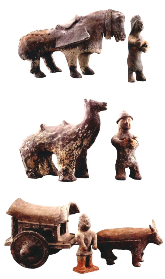 墓內(nèi)隨葬品有陶俑及陶生活器具、家禽及動(dòng)物、牛車(chē)等明器。陶俑共15件,有武士俑、男女侍俑、樂(lè)舞俑等。生活器具有灶、磨、燈、罐等。家禽及牲畜類(lèi)動(dòng)物有豬、犬、雞、羊、馬、駱駝等。