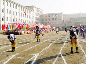陣擺長龍跑馬城?!胺直矊⑦x良才,陣擺長龍對面排。正欲齊心奪勝券,格格送信出城來?!边@首詩描寫的是滿族兒童春季玩的一種游戲——“跑馬城”。玩這種游戲時,孩子們分成人數(shù)相同的兩隊(duì)橫列,面向而站。玩時,甲隊(duì)先誦兒歌一句,乙隊(duì)接下句,一遞一句:“機(jī)機(jī)靈,跑馬場,馬城開,打發(fā)格格送信來!”“你要誰?我要某某某!”被點(diǎn)到名字的兒童立刻向?qū)Ψ經(jīng)_去,對方陣營則手臂相連形成一道防線,沖撞者如果沖破對方的防線,就從對方陣營中挑選一人帶回自己的隊(duì)伍;如果沒有沖破對方的防線,沖撞者就被對方俘虜了。然后雙方再進(jìn)行下一輪“對話”和“沖營”。游戲結(jié)束時,以剩下人數(shù)多的一方為勝方。這種游戲最適合男孩玩,他們往往玩得滿頭大汗,樂此不疲!