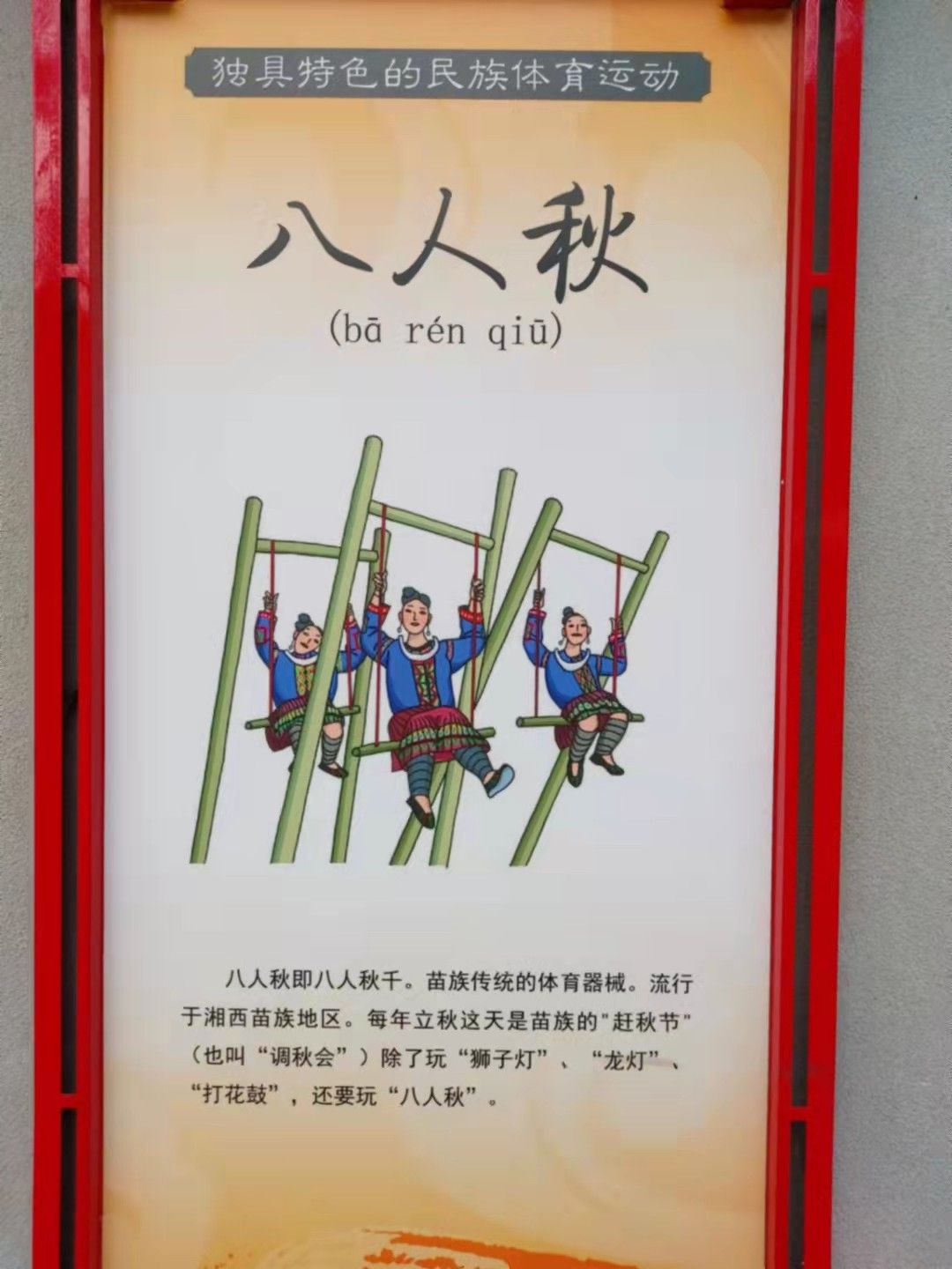 八人秋即八人秋千。苗族傳統(tǒng)的體育器械。流行于湘西苗族地區(qū)。每年立秋這天是苗族的“趕秋節(jié)”(也叫“調秋會”)除了玩“獅子燈”、“龍燈”“打花鼓”,還要玩“八人秋”。