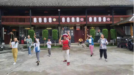 作為傳習所的負責人,何松康不僅在傳習所里教大家霸王鞭,一有空她就帶上霸王鞭,穿上傳統(tǒng)的勞作服飾走出去,給更多的人教學。